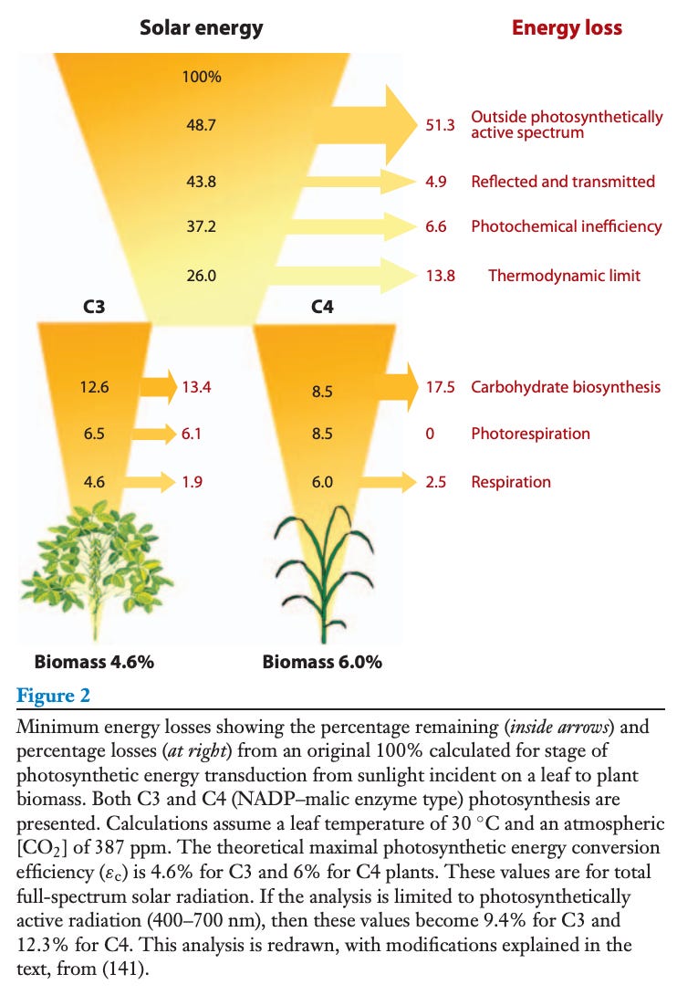 If you’re skimming this section, the two most relevant numbers are 4.6% efficiency for C3 crops (e.g., rice) and 6% for C4 (e.g., maize).