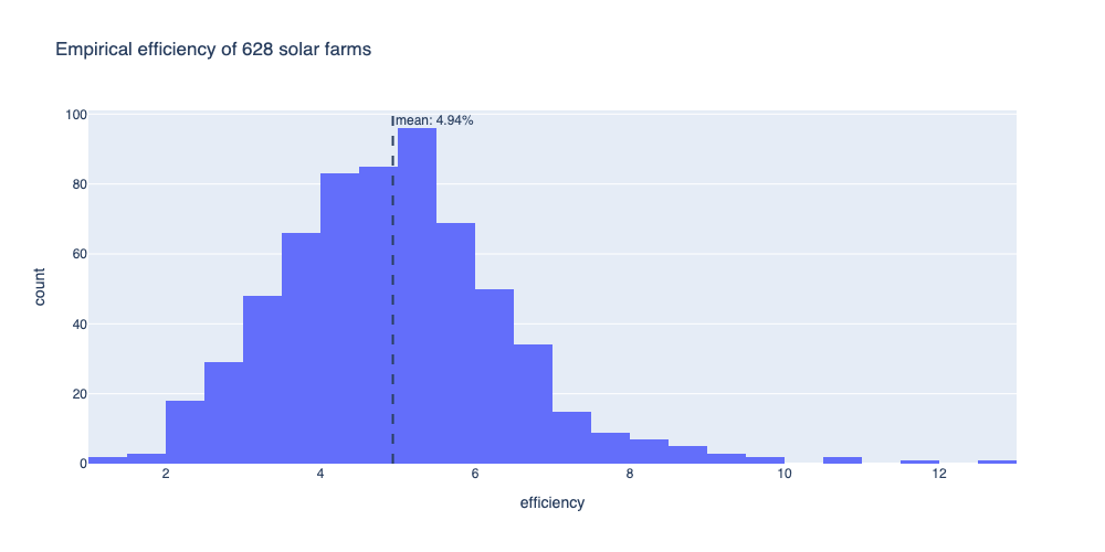 If we examine the system-level efficiency of actual solar farms as compiled by Leger et. al., the average efficiency is about 5%. The best solar farm in the dataset, a five hectare project in Cambodia, reaches 12.86%. For our purposes, commercial solar farms are only 5-10% efficient, nowhere near the 21% that is often taken out of context.