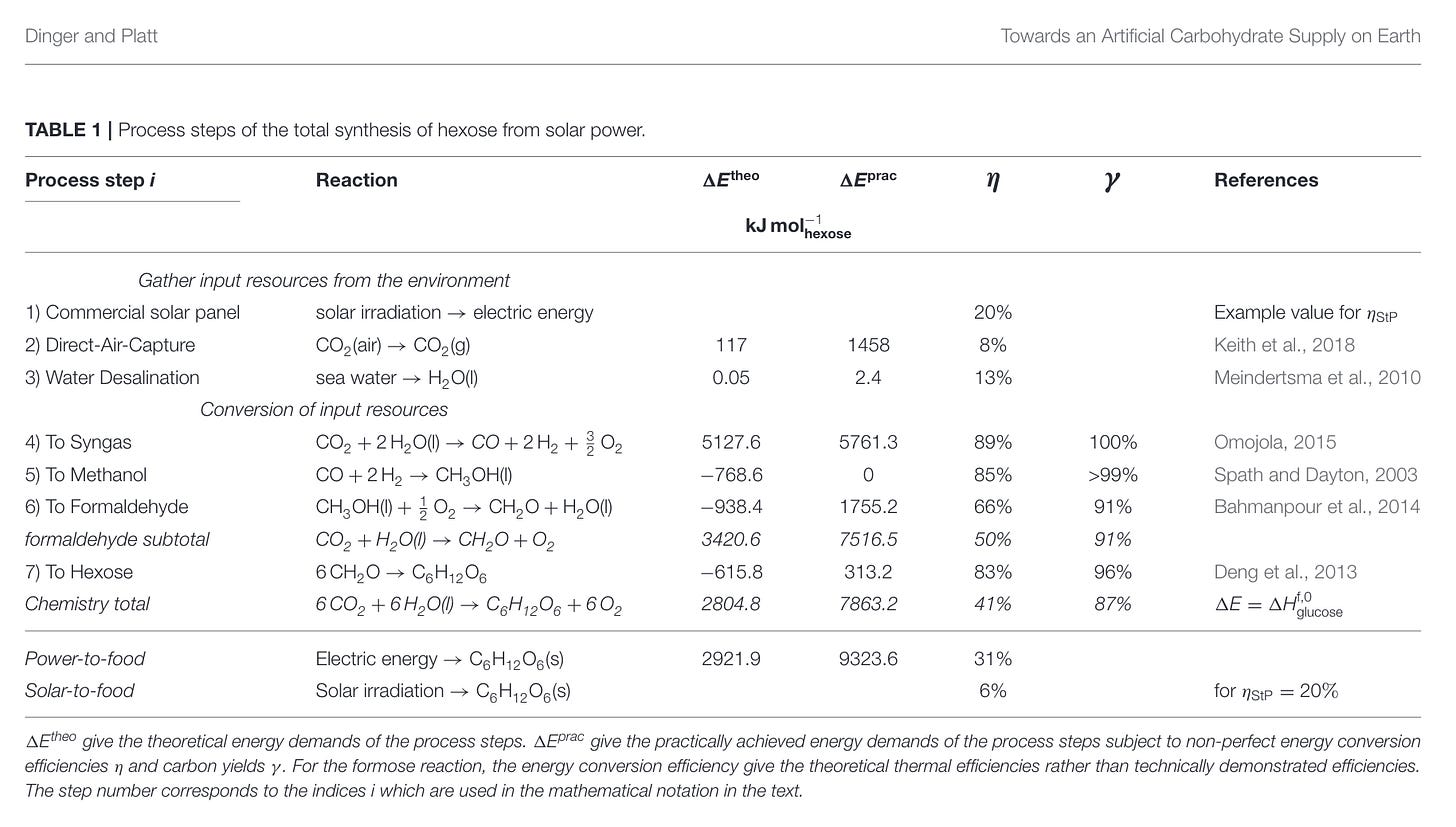 In this section, I’ll examine a theoretical system with no living parts that uses solar photovoltaics to power chemical or enzymatic synthesis of glucose2.