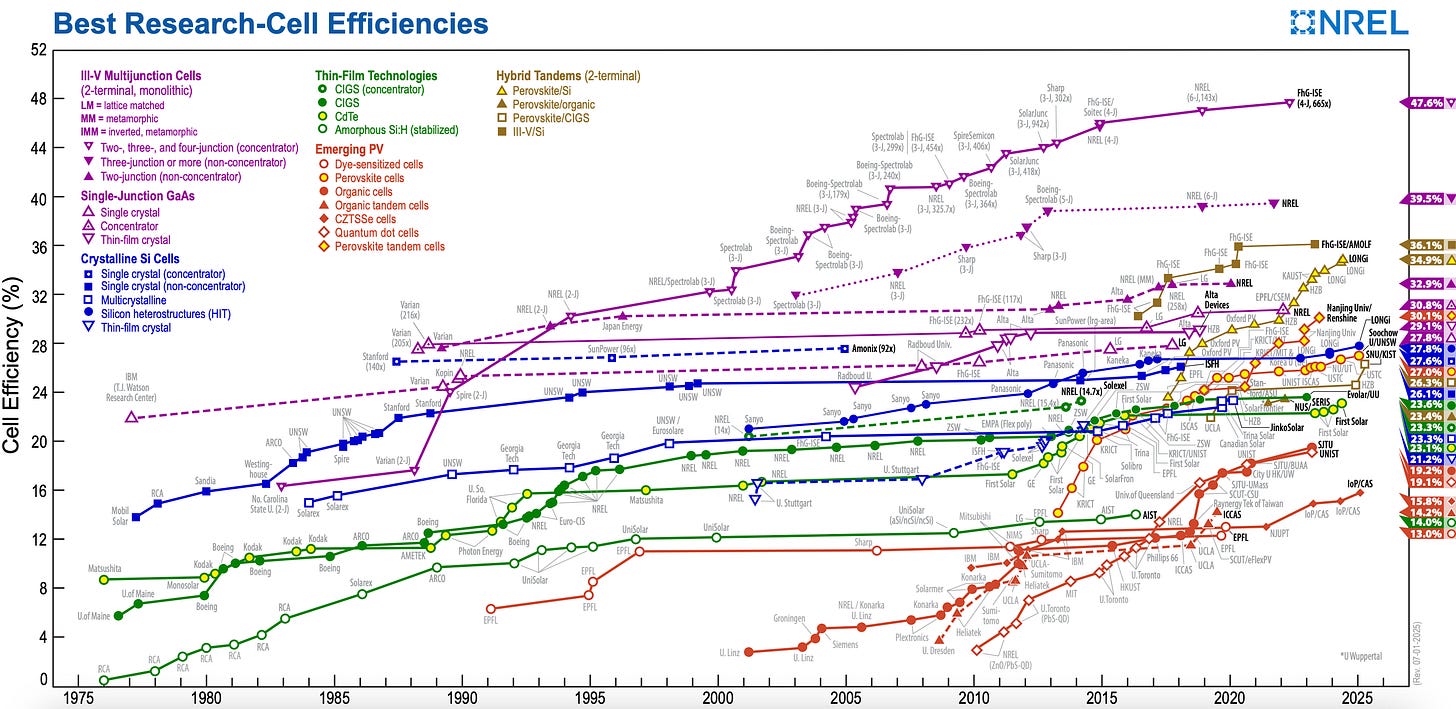 This simple thought experiment reveals that efficiency isn’t everything; geography matters just as much. Even if artificial photosynthesis is no more efficient than a high-performing corn field, we can do it in places with fewer tradeoffs.